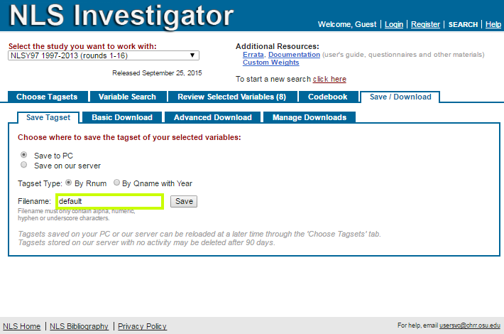 The list will include either Reference Numbers (RNUMs) or Question Names (QNAMEs) with the survey year appended. You can choose either type of list when you save the tagset. There is no functional difference in Investigator between the two options. RNUMs are the traditional unique identifier used in NLS data sets, while QNAMEs sometimes incorporate a brief indication of the variable’s content (such as CV_HGC for Highest Grade Completed). Because the tagset file is a text file, you can open it in any text editor and make changes if desired. This is a convenient way to combine two or more different tagsets.